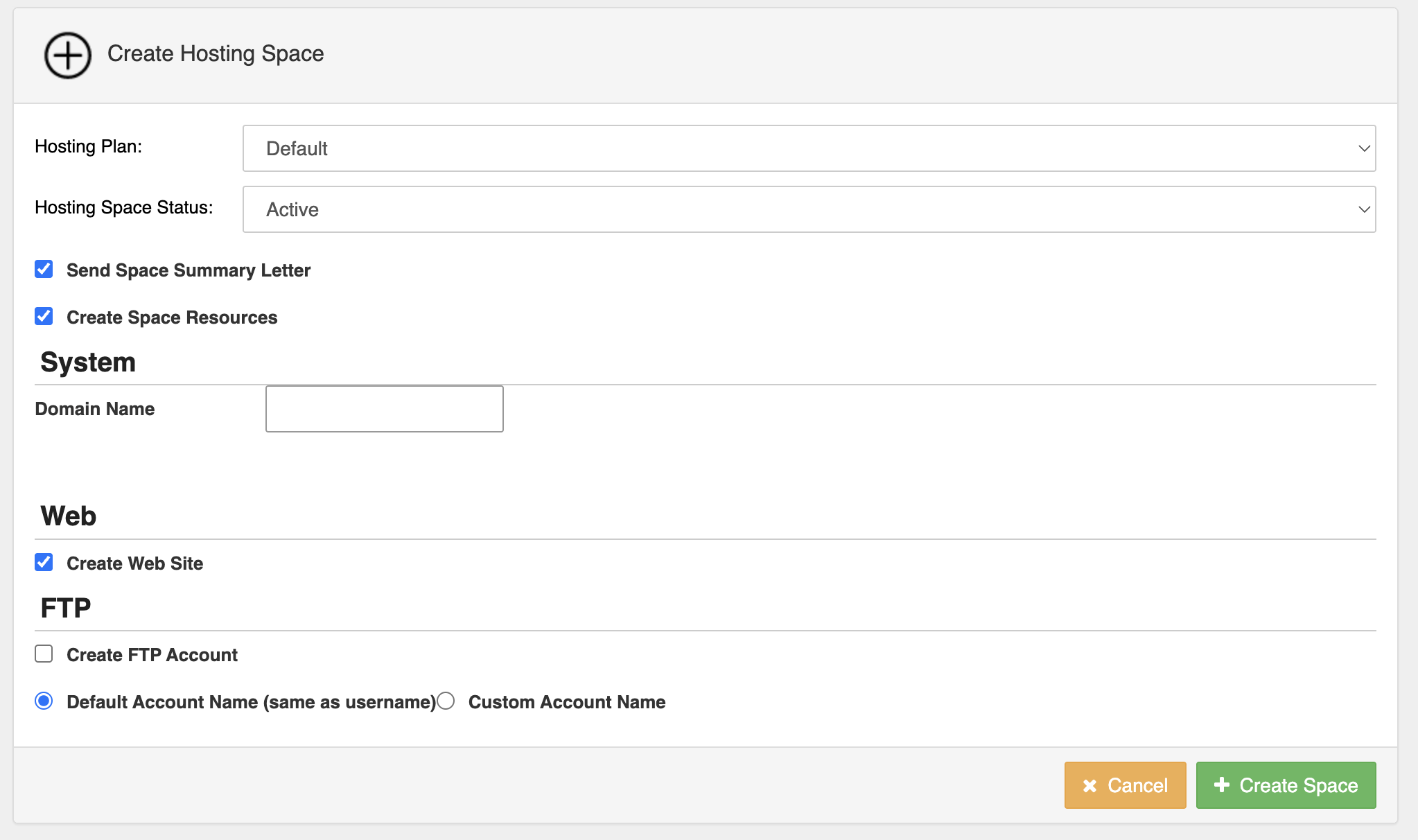 - In the next screen, select the Hosting Plan from the drop down. Select Active option in Hosting Space drop down menu. Enter your domain name in the box, check the checkboxes Create Web Site and Create FTP Account. Click on Create Space button.